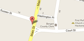 Exit from Route 17 at the Essex Street - Maywood exit. Make a left onto Essex Street. Follow Essex Street to the end. You will be facing the Court House. Make a left onto Main Street. Make first left onto Sussex Street and then a left into the underground parking garage. Enter through the West Wing of Court Plaza South. *